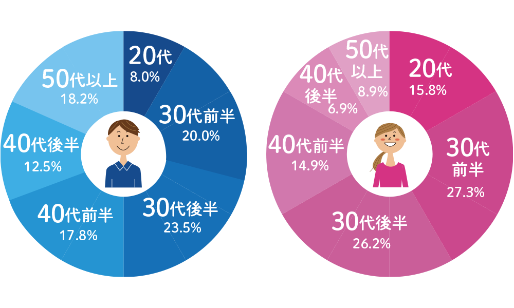 男女ともに、年齢は30代前半~40代前半がボリュームゾーンです。